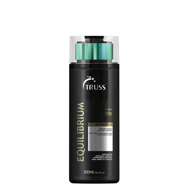 Equilibrium Shampoo de Truss limpia y regula el cuero cabelludo, controlando la grasa sin resecar. Ideal para uso diario en cabellos mixtos o con tendencia grasa. Presentación de 300ml.